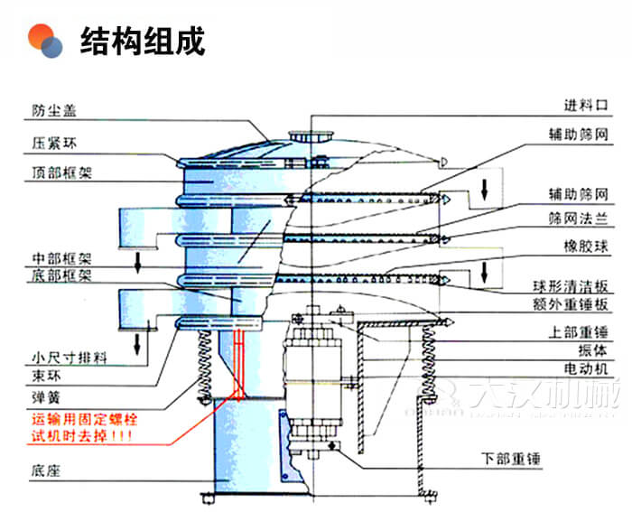 食品振動篩主要由由進料口、防塵蓋、出料口、束環、篩網、配重塊、上部重錘、振動體、振動電機、彈簧、下部重錘、機座等部分組成。