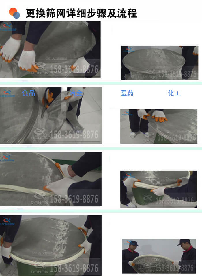 1、先把旋振篩束環螺絲松掉,卸下上框,把已破損的細網取下,代之以新的細網。