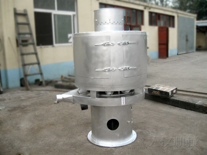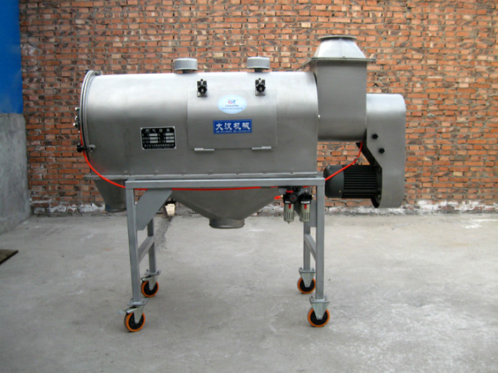氣流篩分機主要是由電機、機座、篩箱、進出料推進裝置等部分組成的。本設備篩網為圓筒狀,置于機體內,作業(yè)時物料不是直接投放到篩體內,而是經由一截螺旋輸送機送入,篩箱內的分流葉片高速連續(xù)轉動,將送入的物料吹起沖向圓筒狀的篩網,細料透過篩網進入成品儲料室,粗料從出料口流出。