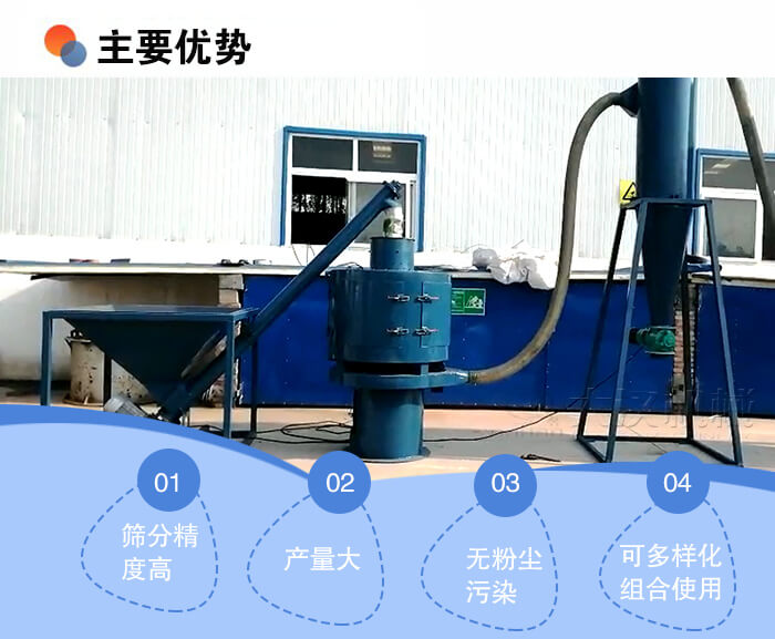 整個篩分程序在負壓半循環(huán)狀態(tài)下進行,無粉塵污染,篩網受旋風的沖刷,可自動清網,降低了篩網堵塞的風險;