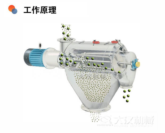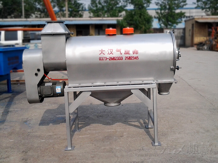 臥式氣旋篩由進料口、除塵口、網籠、螺旋輸送系統、風輪葉片、風輪、主軸、驅動電機、粗料出料口、細料出料口組成。