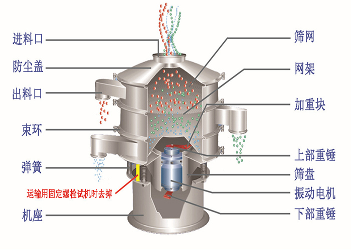 當生石灰經由旋振篩進料口進入旋振篩篩機內部之后,電機上、下兩端安裝的偏心重錘,會將電機的旋轉運動轉變為水平、垂直、傾斜的三次元運動,進而再將這個運動傳遞給篩面,在此過程中,小于篩面孔徑的生石灰通過篩孔落到篩面下層,成為篩下物,大于篩面孔徑的生石灰物料經連續跳躍運動后從排料口排出,以此整個篩分過程結束。