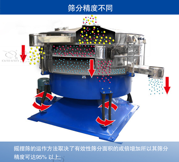 搖擺篩是模仿人工篩分的低頻旋振篩,原材料在篩表面做非線性的三維運動,而振動篩是運用不均衡重錘式使電機做平均水平,垂直,傾斜的三次元運動,進而更改原材料的運動大方向。