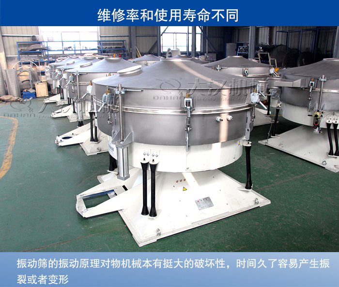振動篩屬于非平衡破壞暴力運動,利用了振動原理來篩分物料,所以會破壞物料的,因此許多顆粒狀結晶焦脆物料不宜振動篩篩分,例如雞精、旋振篩味精、砂糖、熟食這些。而搖擺篩是輕微的橢圓搖擺運動,,對原材料影響不大,不會破壞物料樣子,進一步提高了物料的產出率。