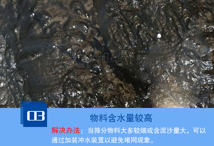 解決辦法:當篩分物料大多較細或含泥沙量大,可以通過加裝沖水裝置以避免堵網現象。