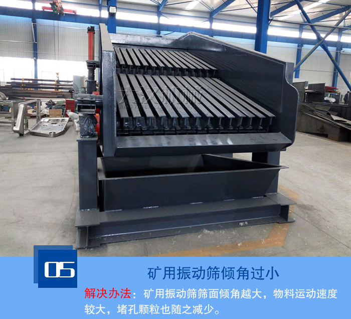 解決辦法:礦用振動篩篩面傾角越大,篩孔的水平投影尺寸越小且顆粒的運動速度較大,很多顆粒來不及透篩就已經從出料端排出,堵孔顆粒也隨之減少。