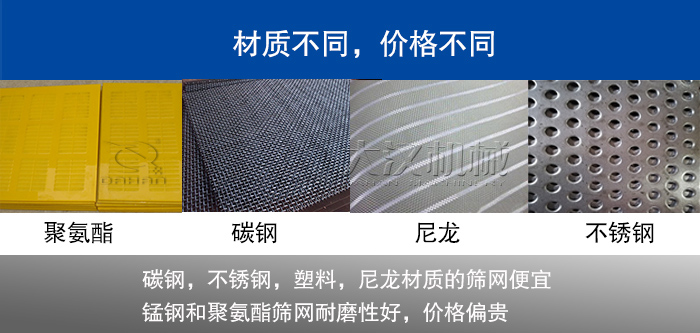 按照振動篩網材質劃分主要由碳鋼、不銹鋼、錳鋼、塑料、尼龍、聚氨酯等多種,其價格的差異主要是在原材料上,一般來說,碳鋼,不銹鋼,塑料,尼龍材質的篩網會比較便宜,而錳鋼和聚氨酯篩網耐磨性好,所以其價格會偏貴一些。