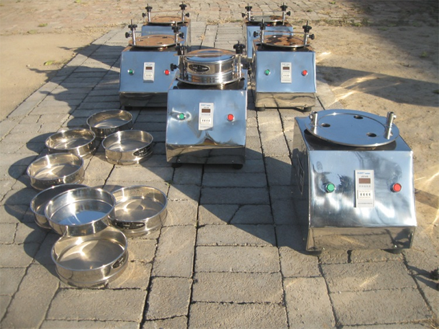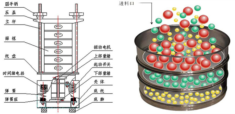 試驗篩機以立式振動電機作為整機振動源,通過振動電機帶動上部振動盤振動,再通過振動盤傳導至安放在振動盤上部的篩框上,然后由需要檢測目數的篩框把小于篩網孔徑的物料顆粒篩分至下層篩框,經過這樣的篩分程序,使每層試驗篩內只留相同粒度的物料,達到不同粒度的分離并確定此物料的粒度組成,使篩框中的物料能夠得到非常有效地過濾、分級、篩分。