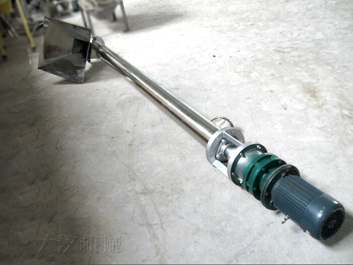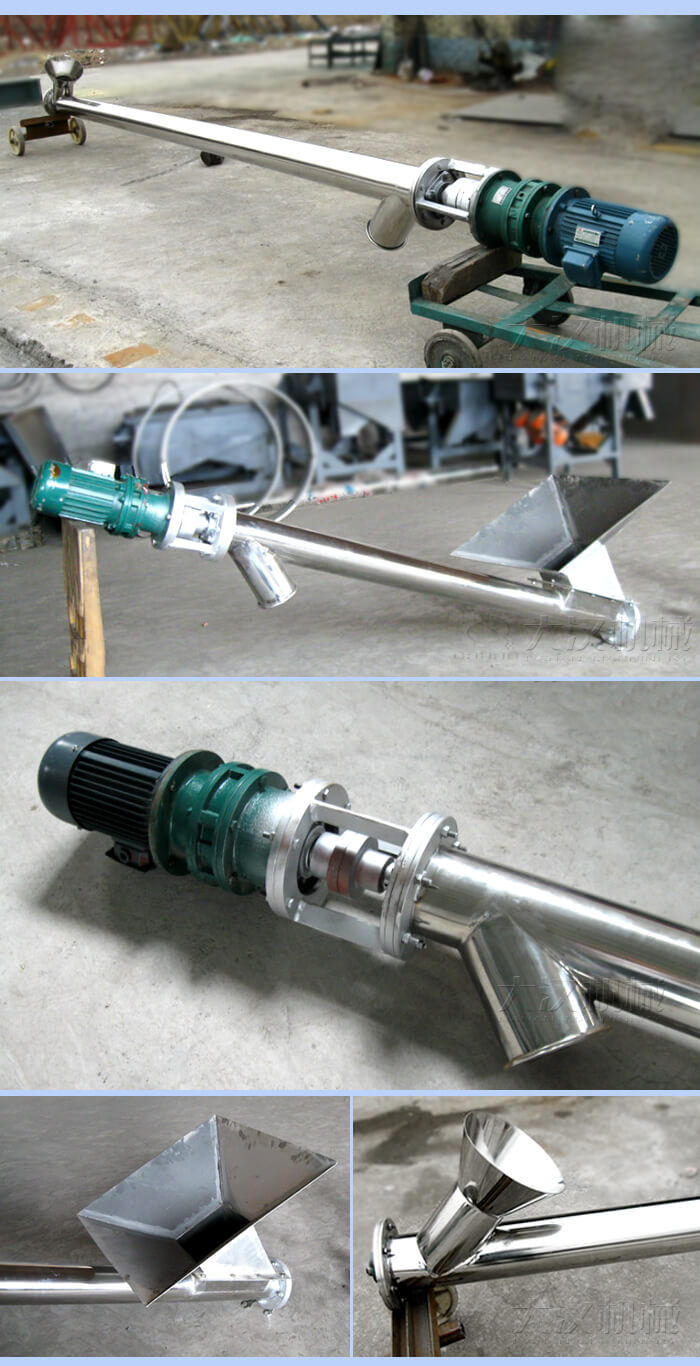 不銹鋼螺旋輸送機主要有傳動裝置、進料口、螺旋軸、輸送管、出料口等部件組成。水平螺旋輸送機是利用旋轉的螺旋將被輸送的物料沿固定的機殼內推移而進行輸送工作,頭部及尾部軸承移至殼體外,吊軸承采用滑動軸承設有防塵密封裝置,軸瓦一般采用粉末冶金,輸送水泥采用毛氈軸瓦,吊軸和螺旋軸采用滑塊連接。